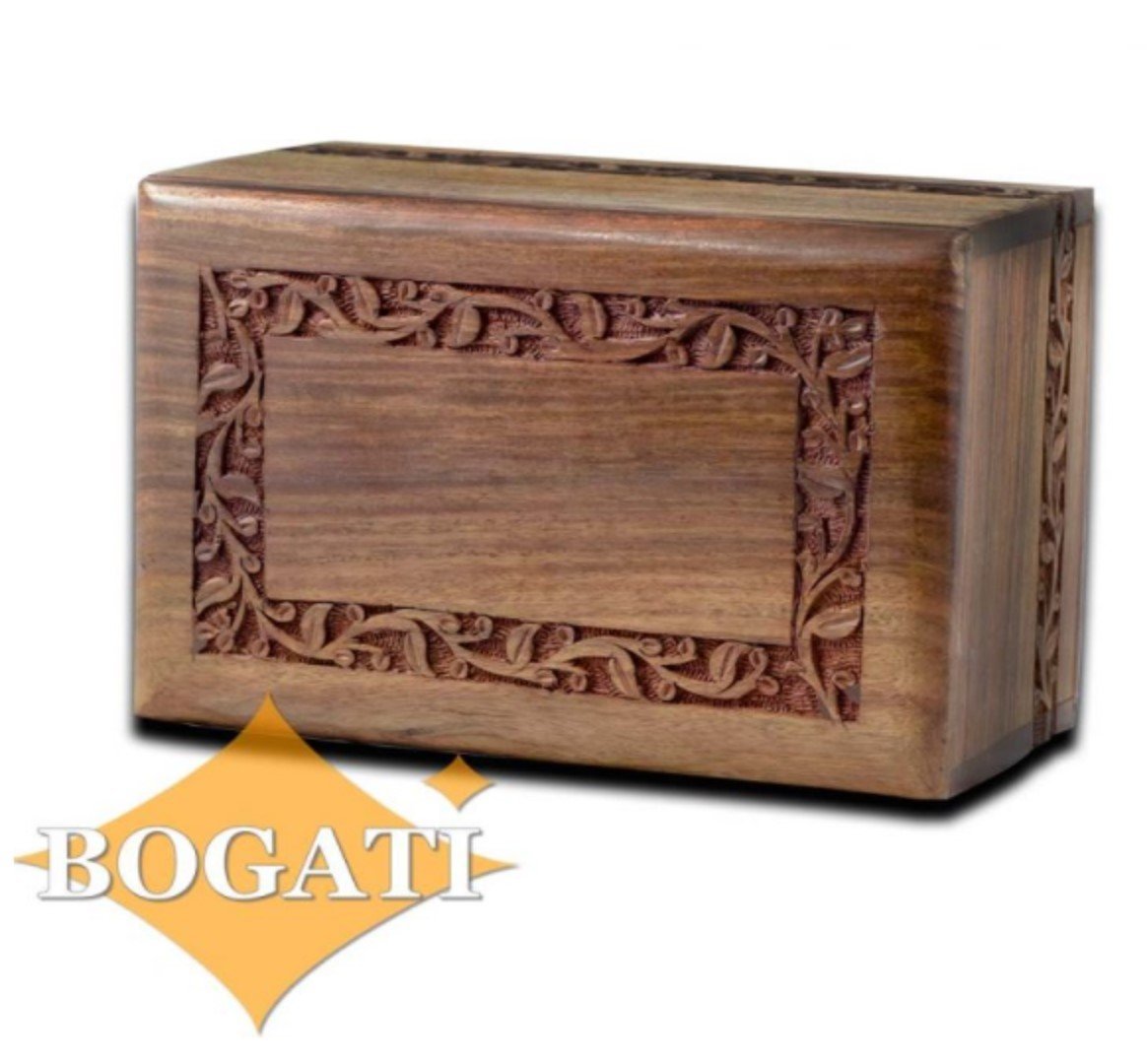 The Bogati cremation urn is made from hand engraved rosewood. Standard size $65. Dimensions: Height: 5.5 inches, Width: 9.0 inches, Depth 6.0 inches. Also available as a small keepsake for $35.