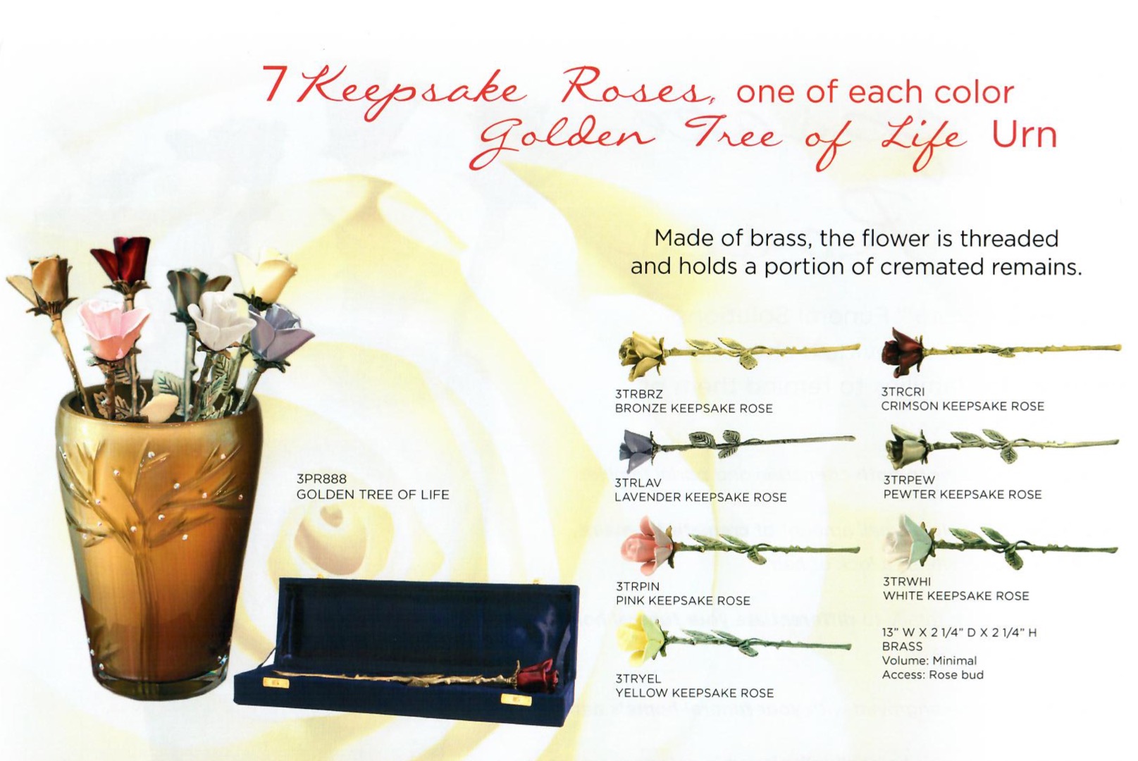 Rose keepsakes are made from brass and have a small compartment in the center of the flower that can contain a small amount of cremated remains, a lock of hair, cemetery grave soil, or another appropriate small item. Each rose keepsake is $175.
